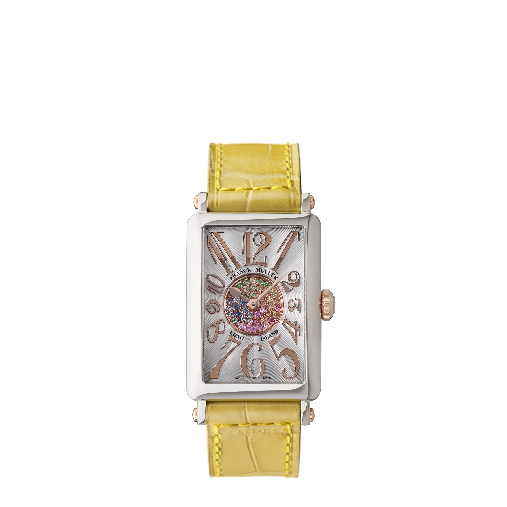 鮮やかな色彩とひとめでフランク ミュラーと分かるエレガントなフォルムが見事に調和し、きらきらと光が溢れる幸せな時間を演出しています。ダイアルの中央には色とりどりのカラーストーンを配し、心が弾むような瞬間を際立たせています。さらに、ゴールドカラーのビザン数字が一層の華やかさを加えています。