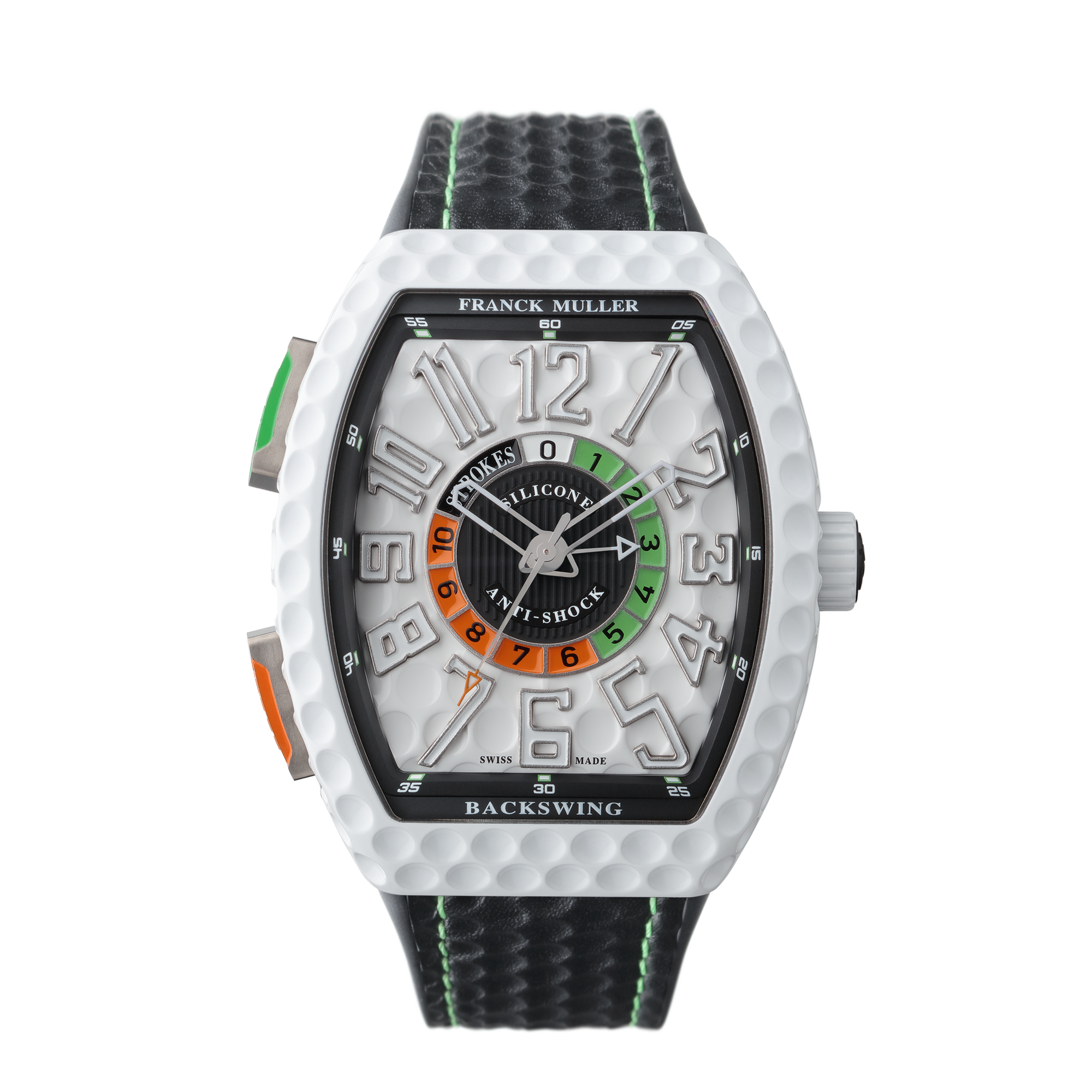 ゴルフボールの球表面にあるディンプルをケースおよびダイアル全体に表現し、美しい曲線と完璧なプロポーションも相まって、新たな構造美を感じさせます。さらに“ヴァンガード バックスイング”に備わる機能は、洗練されたスコアカウンターにあります。操作するボタンもケース左側につけられていることからプレイ中に誤ってカウントされないよう配慮されています。ムーブメントはすべてウォッチランドにて組み立てられ、熟練の職人による丁寧な仕上げが施されています。