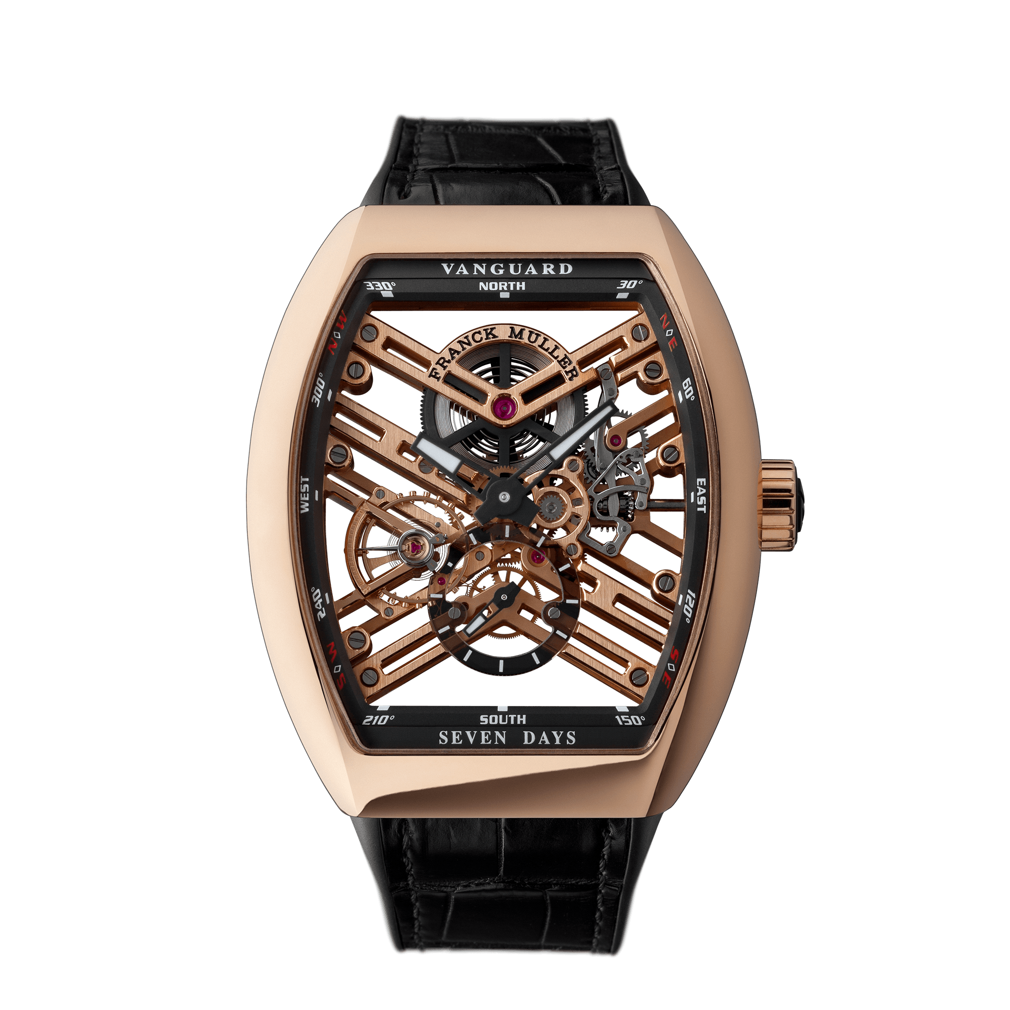 ヴァンガード 7デイズ パワーリザーブ スケルトンは、「FRANCK MULLER」が満を持して開発した至極の手巻きムーブメント「Caliber 1702」を、さらに、文字通り切磋琢磨して完成させた、先進ウォッチメゾンとしてのプライドを具現したプロダクトです。
