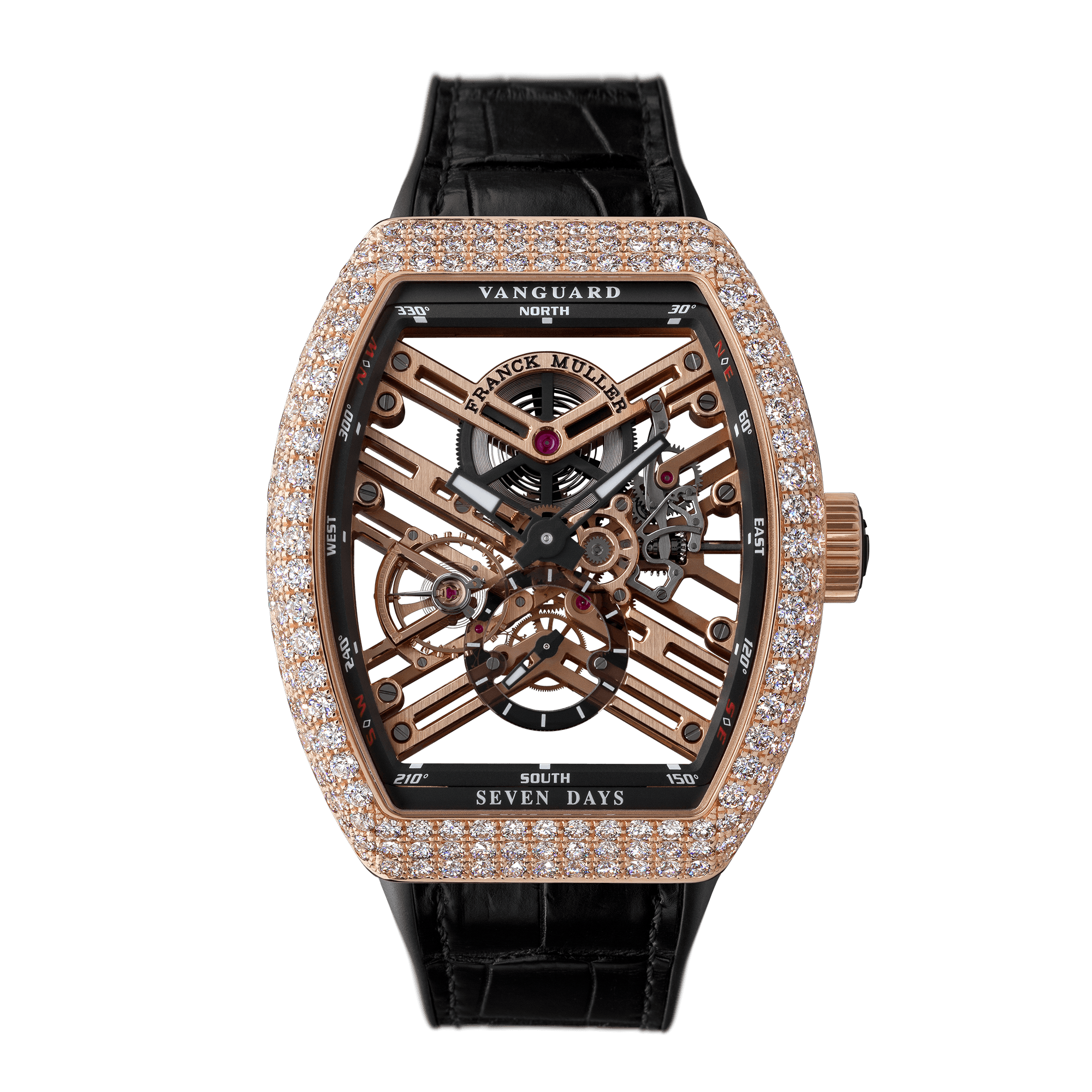 ヴァンガード 7デイズ パワーリザーブ スケルトンは、「FRANCK MULLER」が満を持して開発した至極の手巻きムーブメント「Caliber 1702」を、さらに、文字通り切磋琢磨して完成させた、先進ウォッチメゾンとしてのプライドを具現したプロダクトです。