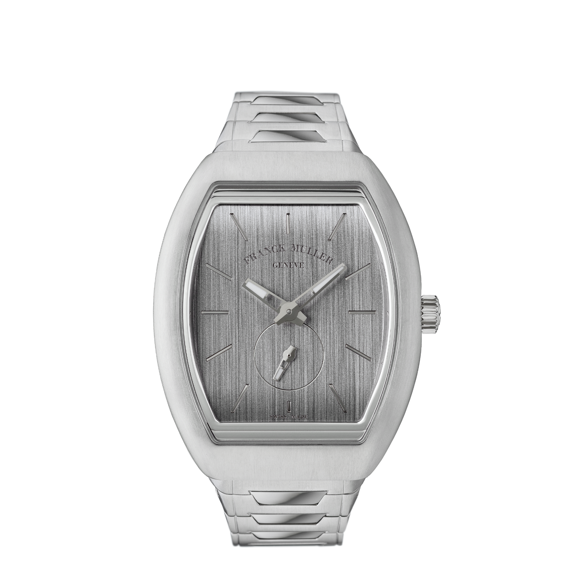 フランク ミュラーの多くの作品では、文字盤上にギョウシェやエナメル塗装、インデックスやロゴなどの仕上げを重ねることで視認性や装飾性を作っています。一方、ヴァンガード スリム モノリスでは、これらの要素を入れるのではなく、文字盤プレートそのものに彫刻加工を施す手法を採用しています。ロゴおよびインデックスは“加える”のではなく“刻む”ことで表現され、文字盤と表示要素が物理的にも見た目にも一体化しています。