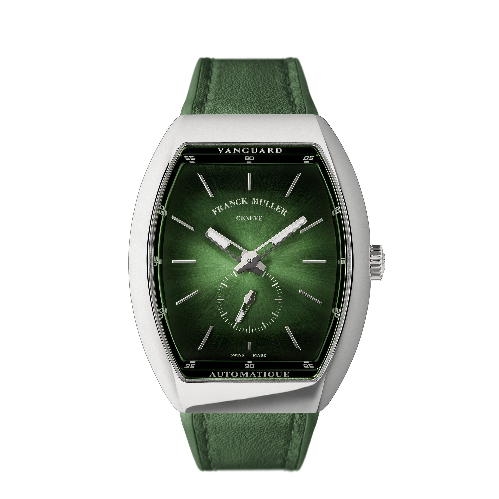 アヴァンギャルド ドレス: 文字盤と同色のストラップをしつらえることで、色彩の連続性を追求。フランク ミュラーの「ヴァンガード スリム スフマート」が提唱する、革新とエレガンスが融合した「アヴァンギャルド ドレス」の理想形を体現しています。