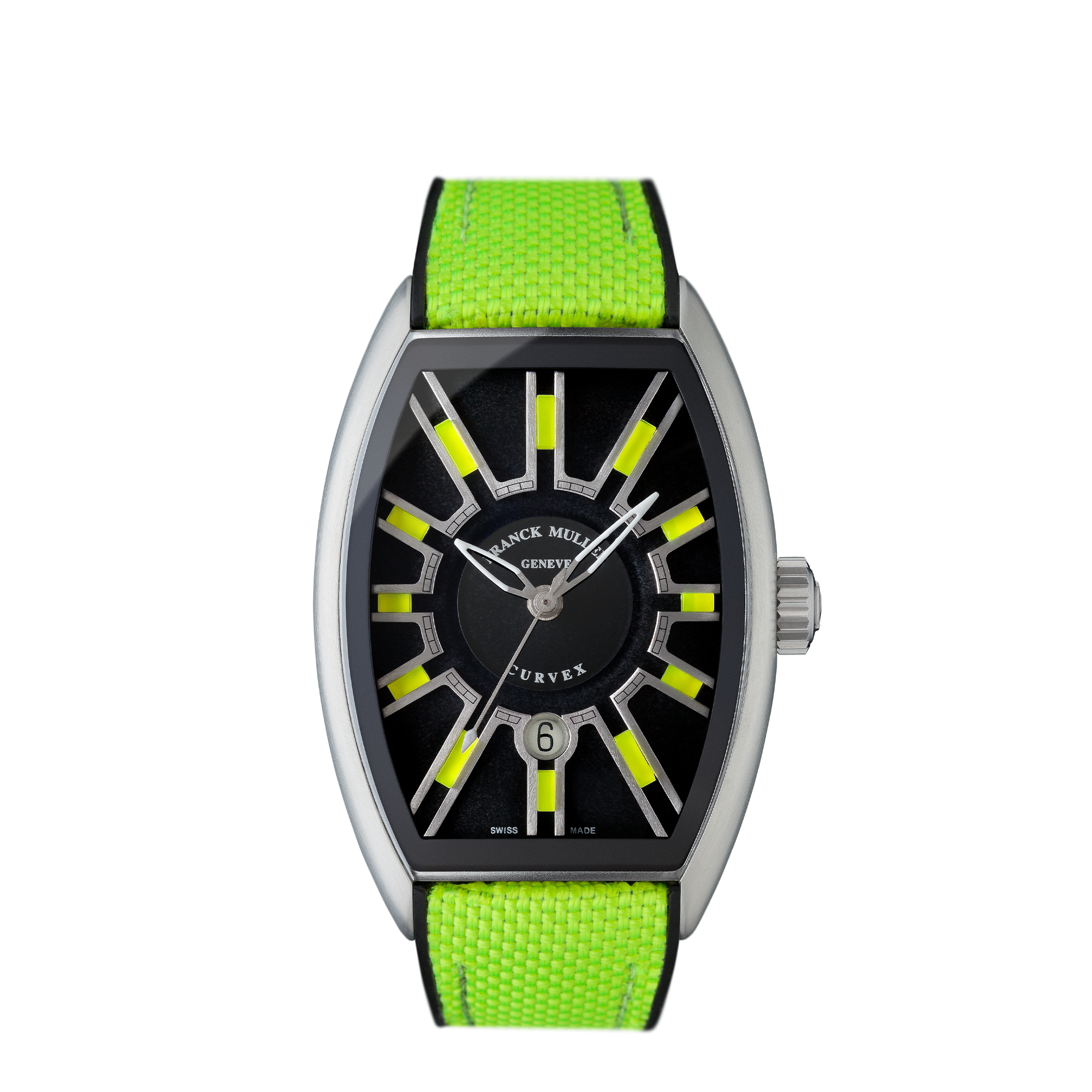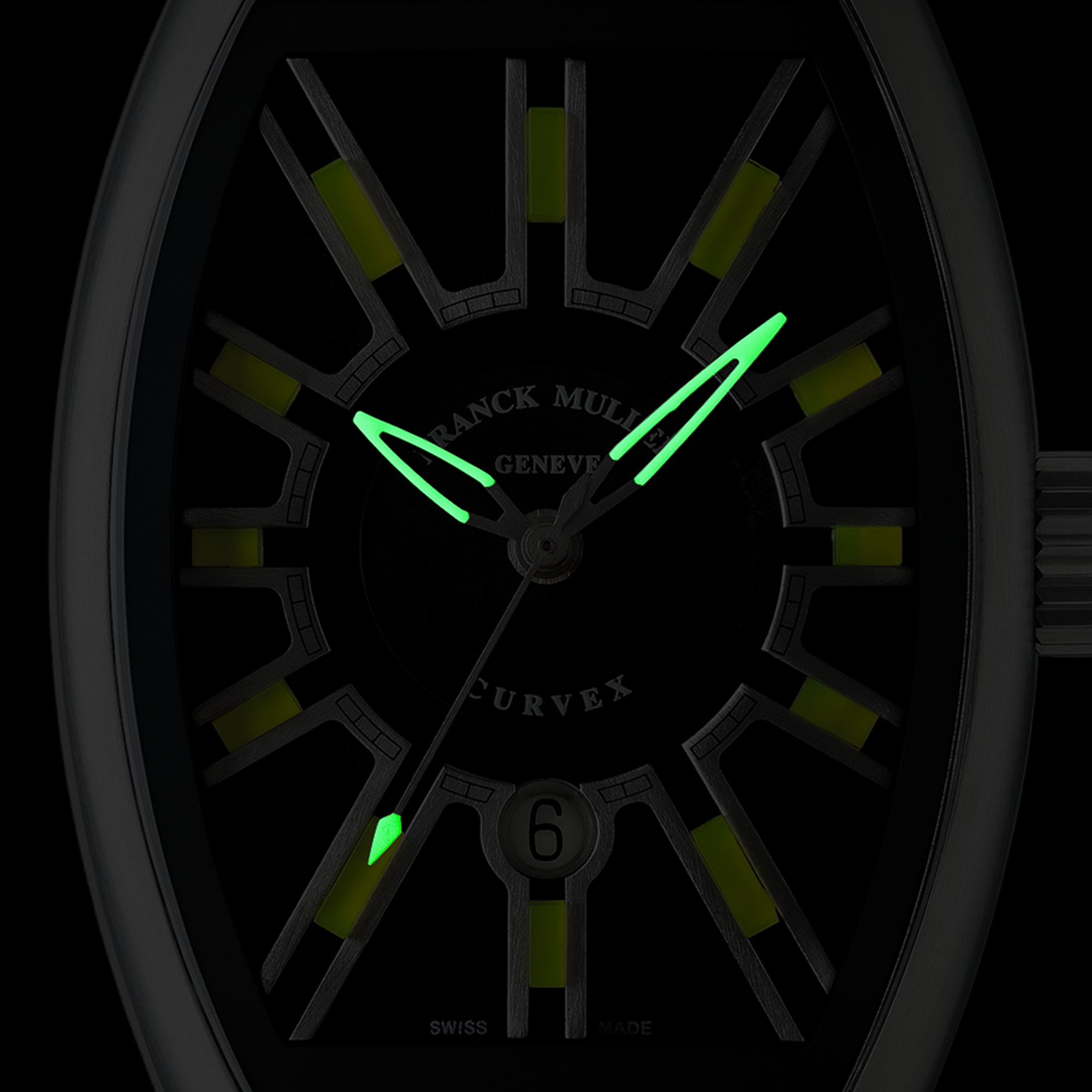 グランド カーベックス フラッシュは、レンズや風防などに使われる透明性の高い樹脂素材に、蛍光を発する蛍光分子を組み込んだバーインデックスを採用しています。このモデルの真髄は、光と素材による複合的な効果であり、すべての要素が文字盤の中心に向かって収束しているように感じさせるところです。さらに、このダイナミックな効果を高めるため、文字盤には、レーザーによる粒状のテクスチャー加工を施し、光の吸収を最大限に促進。さらに、中央部分に透明度の高い素材を配置し、微妙なコントラストを与えることでバーインデックスの輝きを高め、文字盤が独特の深みを醸し出しています。