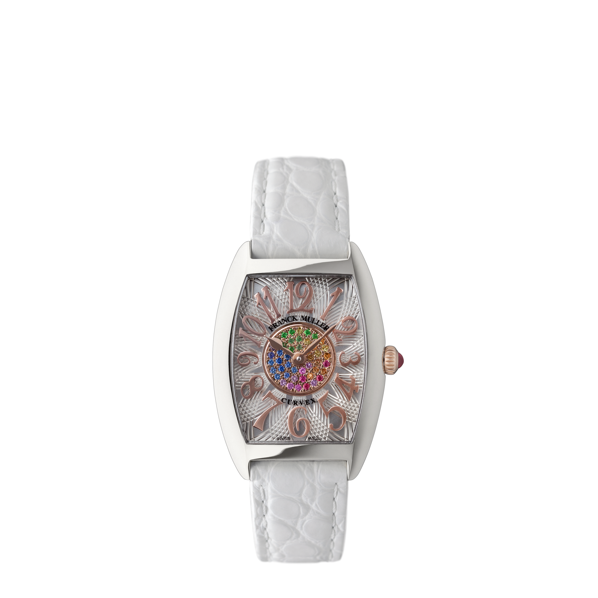 鮮やかな色彩とひとめでフランク ミュラーと分かるエレガントなフォルムが見事に調和し、きらきらと光が溢れる幸せな時間を演出しています。ダイアルの中央には色とりどりのカラーストーンを配し、心が弾むような瞬間を際立たせています。さらに、ゴールドカラーのビザン数字が一層の華やかさを加えています。