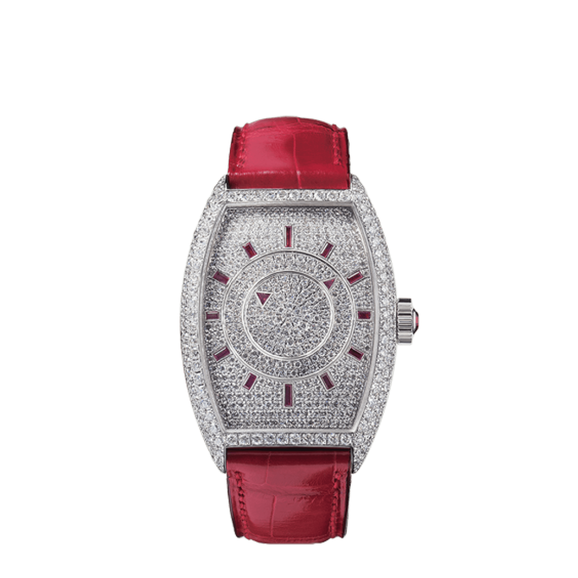 Two rotating discs for hours and minutes Dial with diamond and ruby indexes
