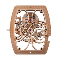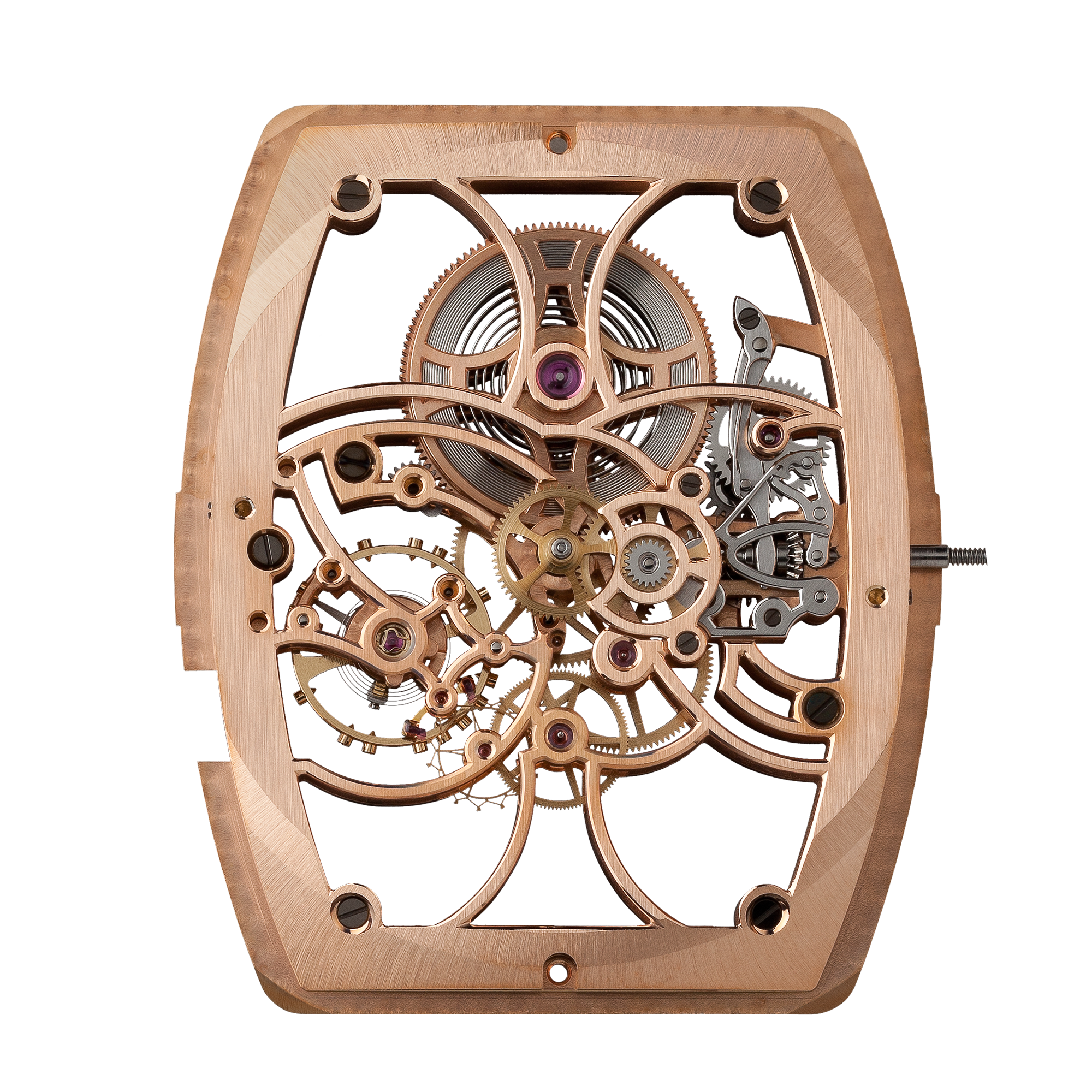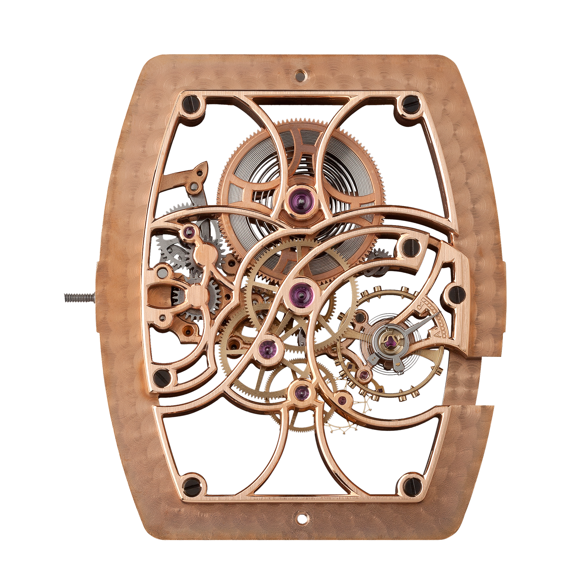 本来時計の顔となる文字盤を排除し、その下層部にあるムーブメント全体を極限まで削ぎ落とています。徹底した躯体構造のみの美しさに心血を注ぎ、細部に至るまで徹底されています。9時位置のチラネジ付きモノメタルテンプの中心部にある銀色の緩急針は、本来は機械の裏側に配置されるべきもので、時計師だけが見る裏方の調整針を、あえてデザインの一部とする洒落たな演出が施されています。